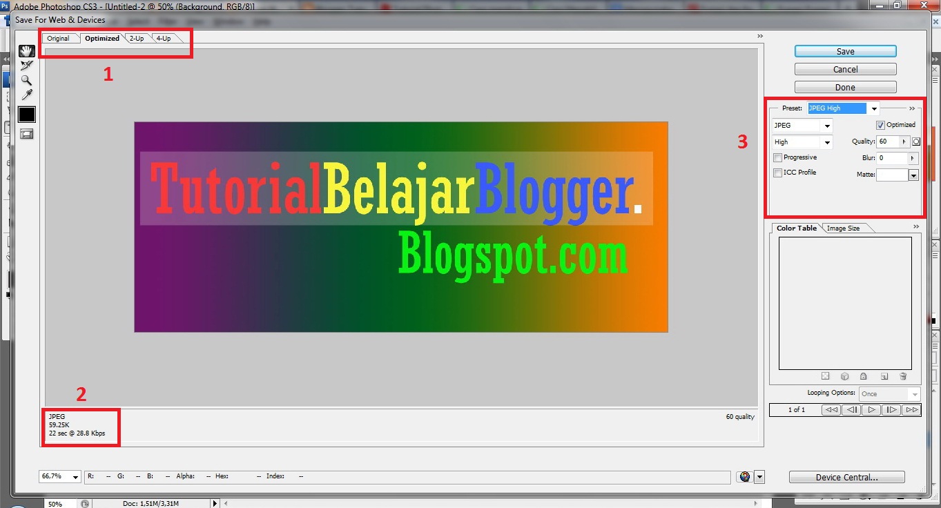 - Kotak 2: Preview ukuran kompresi serta kecepatan ketika loading file image/gambar tersebut di web/blog.